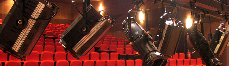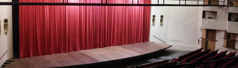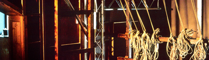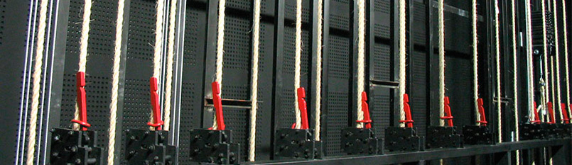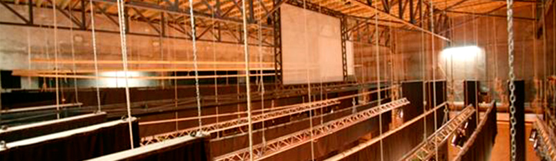 Varas cênicas ou de iluminação motorizadas, tracionadas através de cabos de aço, movimentadas por motorredutor e freio, acionadas através de caixa de comando com acionamento por botoeiras na cabine de comando.
